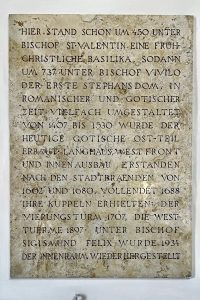 Am Standort des Stephandoms: „Hier stand schon um 450 a.d.unter Bischof St.Valentin eine frühchristliche Basilika„, ein nach dem Vorbild der antiken Basiliken gestaltetes Kirchengebäude romanischer Zeit.