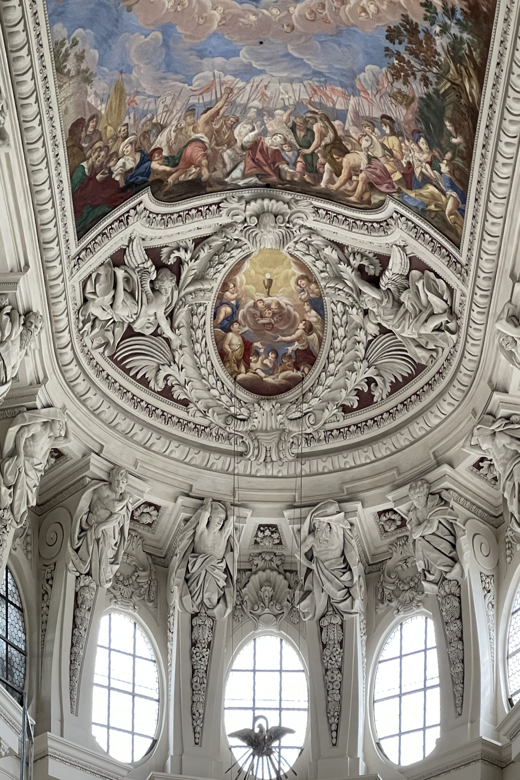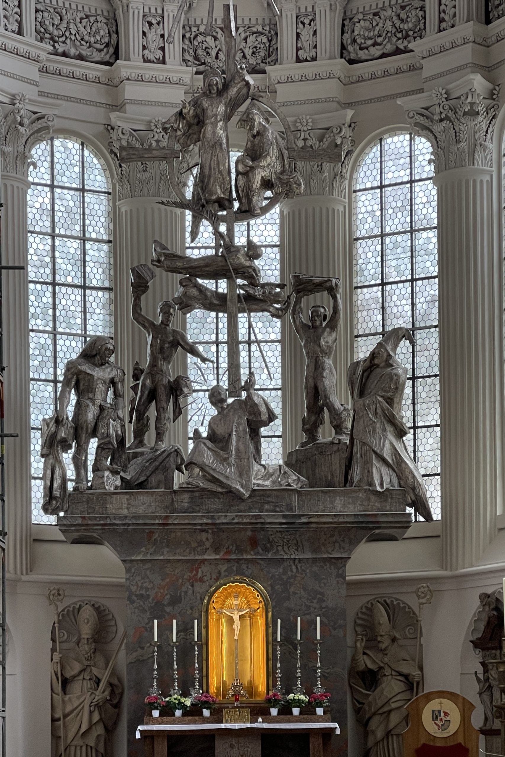 Gegoogelt: Carlo Lurago schuf, trotz der gotischen Anlagen harmonisch wirkend (Scheitelhöhe 29 m; bei einer Mittelschiff-Breite von nur 12 m), einen in sich stimmigen hochbarocken Kirchenraum im italienischen Stil. Der Hochaltar, der die Steinigung des hl. Stephanus zeigt, entstand erst 1947 bis 1953. Dieser Altar ist einzigartig schön und wirkt mit dem durch das grosse Fenster dahinter einfallenden Licht erhaben und irgendwie wie nicht von dieser Welt(Video).