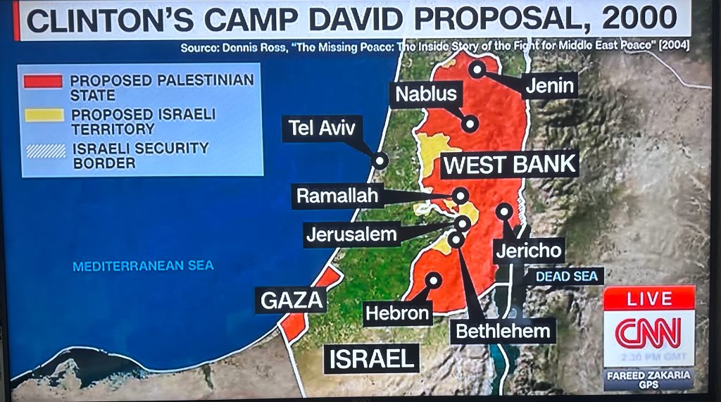 Sieben Jahre nach der Oslo-Vereinbarung, in 2000, wurde ein Teilungsplan (siehe Abb.aus Dennis Ross’Studie aus 2004) im Oslo-Rahmen verhandelt, den Arafat bei seinen Kollegen in Ramallah allerdings damals nicht durchsetzen konnte: Camp David II.