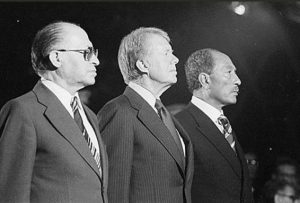 Beim Versuch, die Bombe zu entschärfen, kam ein deutscher Brandmeister der Feuerwehr ums Leben. Das Foto zeigt Begin mit Carter und dem Kollegen Sadat aus Ägypten, mit dem der ehemalige Terrorist Begin 1978 den Nobelpreis erhielt.
