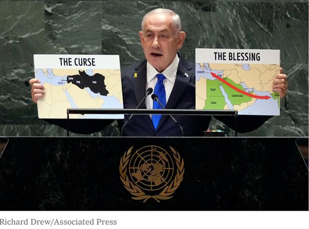 Netanjahu müsste mit der israelischen „Partei Gottes“brechen – der Koalition aus rechtsextremen jüdischen Siedlern und Messianisten, die wollen, dass Israel dauerhaft das gesamte Gebiet vom Jordan bis zum Mittelmeer kontrolliert, ohne Grenzlinien dazwischen – genau wie auf der Karte, die Netanjahu kürzlich der U.N.-Generalversammlung präsentierte (ohne Grenzen vom Meer bis zum Jordan auf dem „blessing“-Teil !).