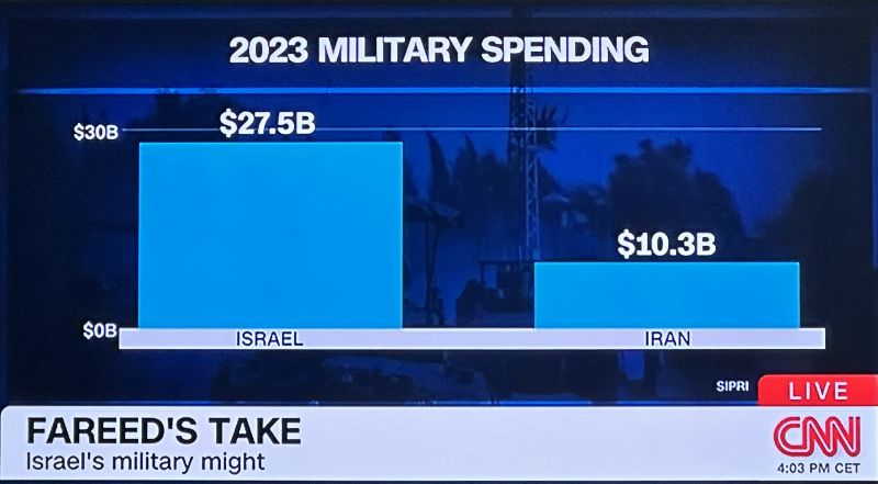 Diese überlegene Wehrfähigkeit zeigt sich nicht nur in den Verteidigungsausgaben (siehe CNN-Bild: Fareed’s Take) – besonders im Verhältnis zur Bevölkerungszahl (Israel<10 Mio, Iran > 80 Mio), sondern auch in technologischer Potenz und „Intelligenz“ (=Geheimdienste).