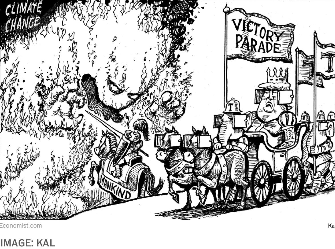 Trumps Leugnung des Klimawandels – trotz der sich in immer kürzeren Abständen wiederholenden Katastrophen auch und wieder besonders im eigenen Land – fallen in die Kategorie des Glaubens, bzw. Nichtglaubenwollens.