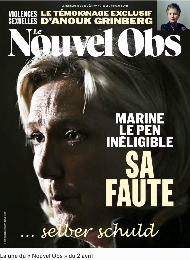 Le NouvelObs: « Il convient de rappeler que l’égalité devant la loi est un pilier de la démocratie. » – also es sei angebracht, daran zu erinnern, dass das Gesetz (eigentlich das Recht) eine Säule der Demokratie ist … und … selber schuld … wenn sie nun „politisch tot“ (Marine LePen, letzte Woche) ist, selbst schuld – SA FAUTE