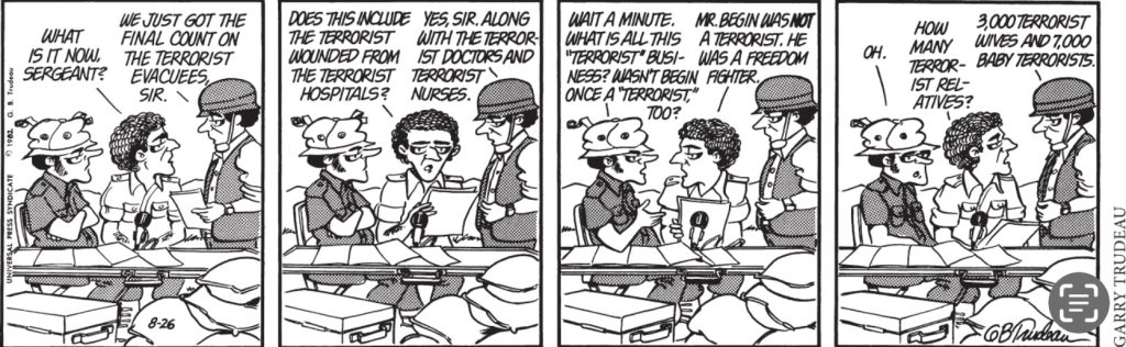 Der Cartoon entstand 1982, als Israel in den Libanon einmarschierte, um die PLO zu liquidieren oder „wenigstens zu vertreiben“(wohin?) und dabei rein gar keine Rücksicht auf die zivilen Bewohner, die „Nicht-Kombattanten“ nahm.