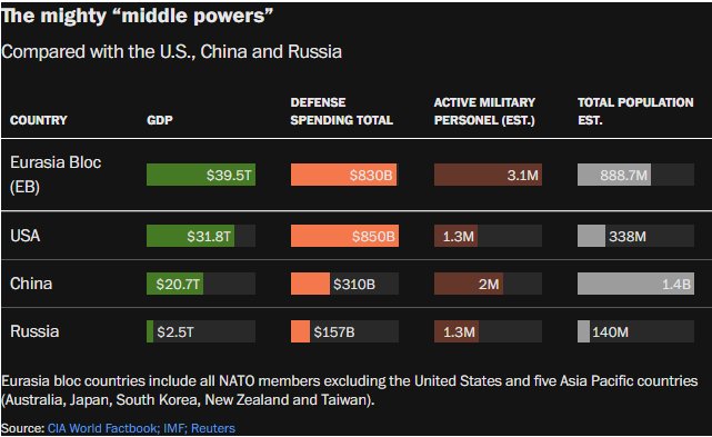Zusammengefaßt in dieser Übersicht sind die demokratisch verfaßten europäischen und asiatischen Staaten als EB = Eurasia Bloc. Verglichen werden Bruttosozialprodukt, Verteidigungsausgaben und aktives Militärpersonal mit diesen Parametern die Potenz der USA, China und Russland.