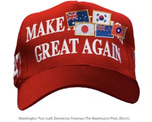 Max Boot hat diese in seinem Washington Post Beitrag „America is alienating what could become a superpower“ ausführlich beschrieben. Dazu die modifizierte MAGA-Kappe, auf der America durch Nationalembleme von Fernost – Australien und Neuseeland ersetzt wurde.